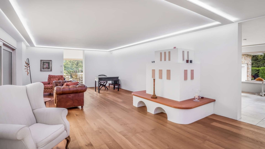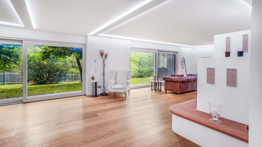 Der ca. 70 m² große, lichtdurchflutete Wohnraum öffnet sich über bodentiefe, großflächige 3-fach verglaste Fensterfronten und zwei Schiebetürelemente zum weitläufigen, pflegeleicht angelegten Gartenparadies. Umlaufende, blickgeschützte Terrassen laden zum Verweilen und Entspannen ein.
