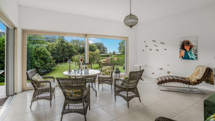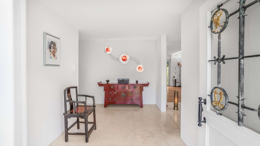 Nach Süden hin öffnet sich das Gebäude mit großzügigen Fenster- und Türelementen zur weitläufigen Terrasse und zum idyllischen Garten mit altem Baumbestand. Das ca. 2.600 m² große Grundstück ist nahezu uneinsehbar und mit Rasenflächen, Zierpflanzen und mediterranem Aufwuchs harmonisch gestaltet.