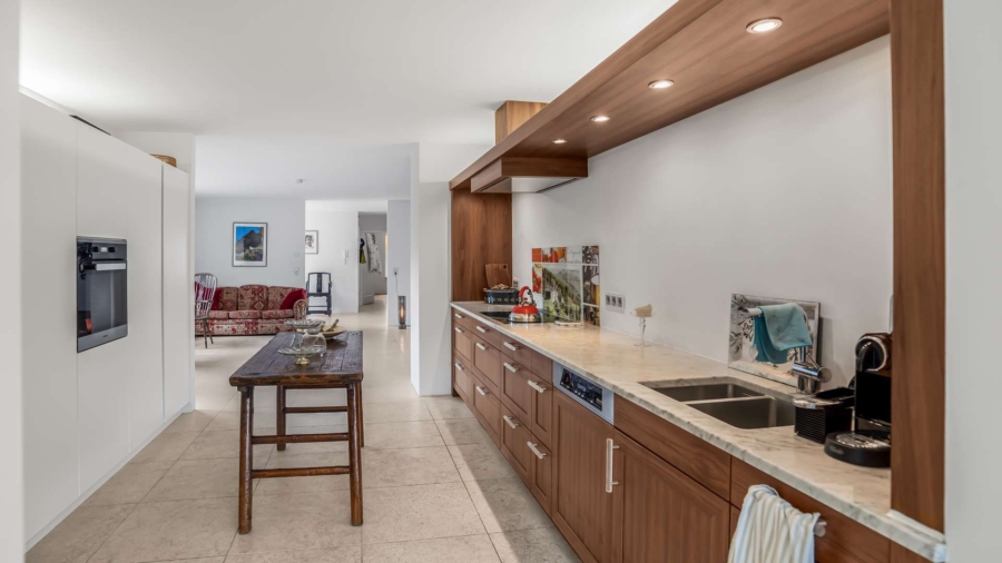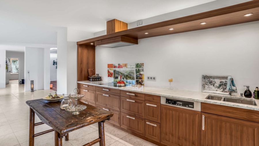 Die mediterran inspirierte Küche wurde als moderne Einbauküche in Holzoptik gestaltet und fügt sich harmonisch in den offenen Wohn- und Essbereich ein. Viele praktische Einbauten im gesamten Haus bieten zusätzlichen Komfort. Für stilvolle Akzente sorgen Natursteinfliesen und hochwertige Echtholzparkettböden, ergänzt durch modernste Haustechnik mit LED-Beleuchtung.