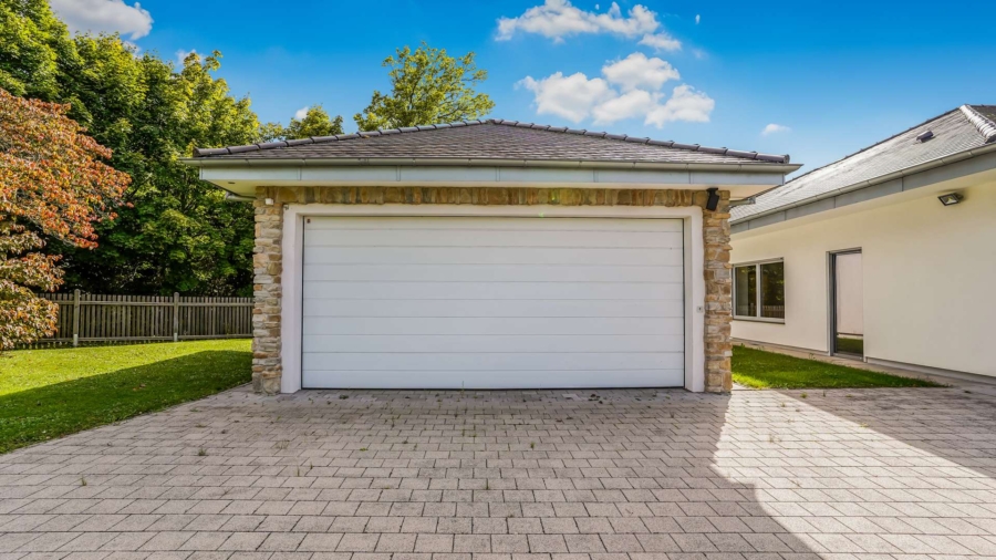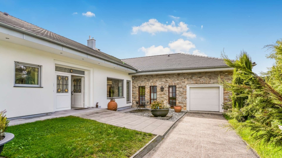 Ein besonderes Merkmal ist die außergewöhnliche Fassadengestaltung: Als markanter Blickfang wurden die Witterungsfronten des Haupthauses sowie des freistehenden Garagengebäudes mit Natursandstein verkleidet. Die geräumige, neu errichtete Doppelgarage grenzt direkt an das Haupthaus an. Das flachgeneigte Zeltdach wurde im Zuge der Generalsanierung komplett neu konstruiert und mit Biberschwanzziegeln eingedeckt, die Fassade erhielt eine Wärmeschutzdämmung. Ebenso wurde die gesamte Elektrik sowie sämtliche Abwasserleitungen vollständig erneuert.