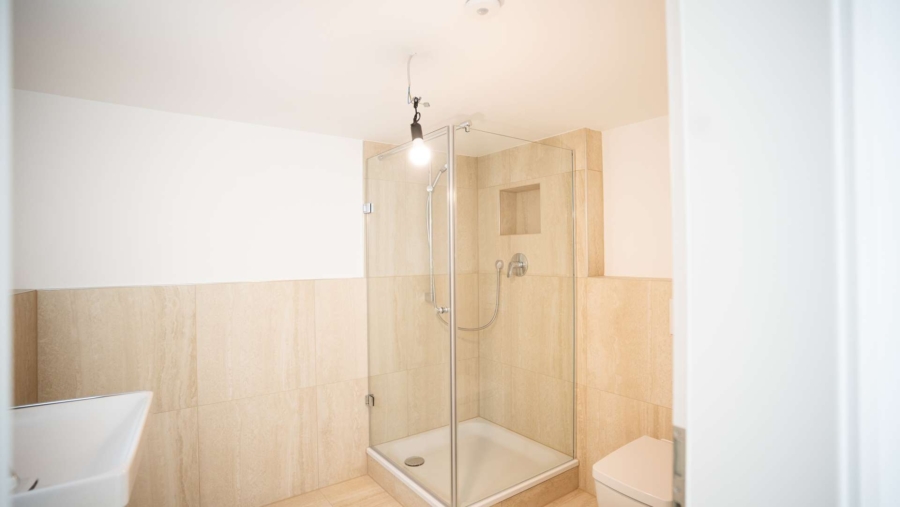 Das Dachgeschoss besticht durch einen über 40 m² großen Master-Bedroom mit Ankleide sowie ein luxuriöses Badezimmer im XXL-Format. Ergänzt wird diese Ebene durch ein weiteres Zimmer mit separatem Duschbad. Sämtliche Bäder wurden in Natursteinoptik mit eleganten weißen Sanitärobjekten und Fußbodenheizung ausgestattet. Für maximale Energieeffizienz sorgt eine neu installierte Luftwärmepumpe in Kombination mit einer Photovoltaikanlage.