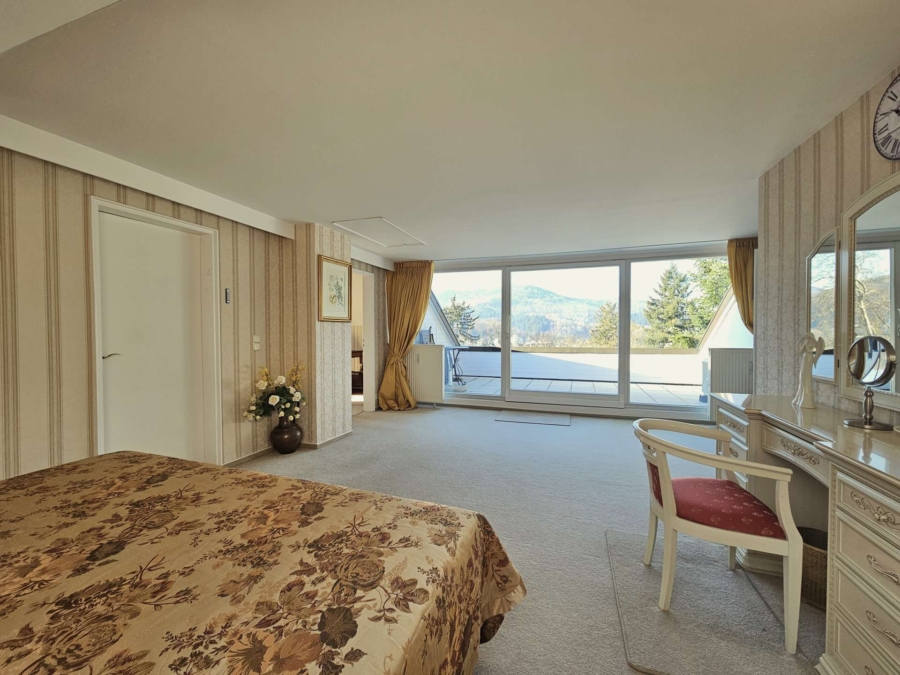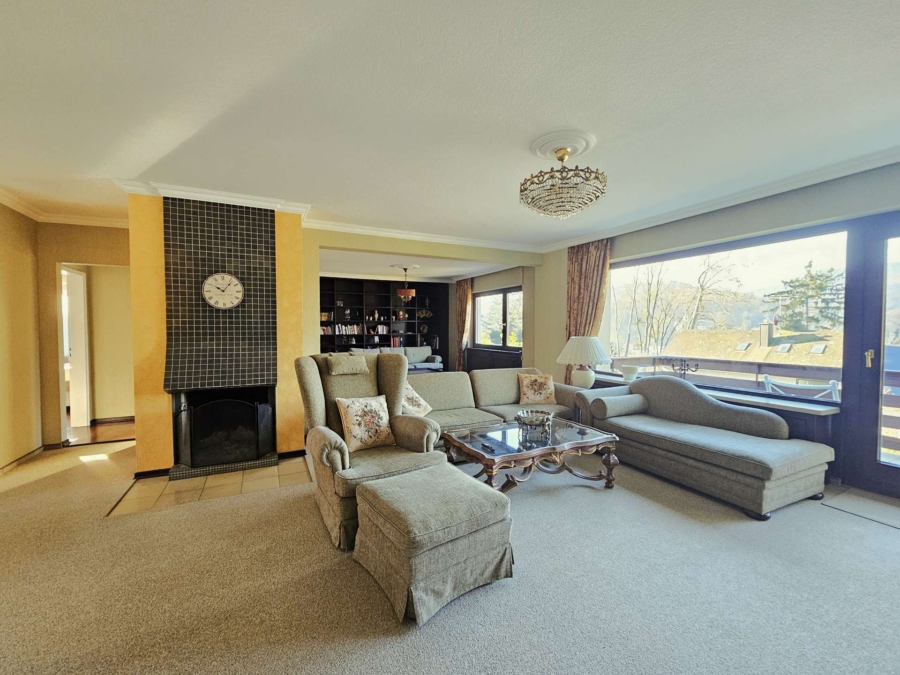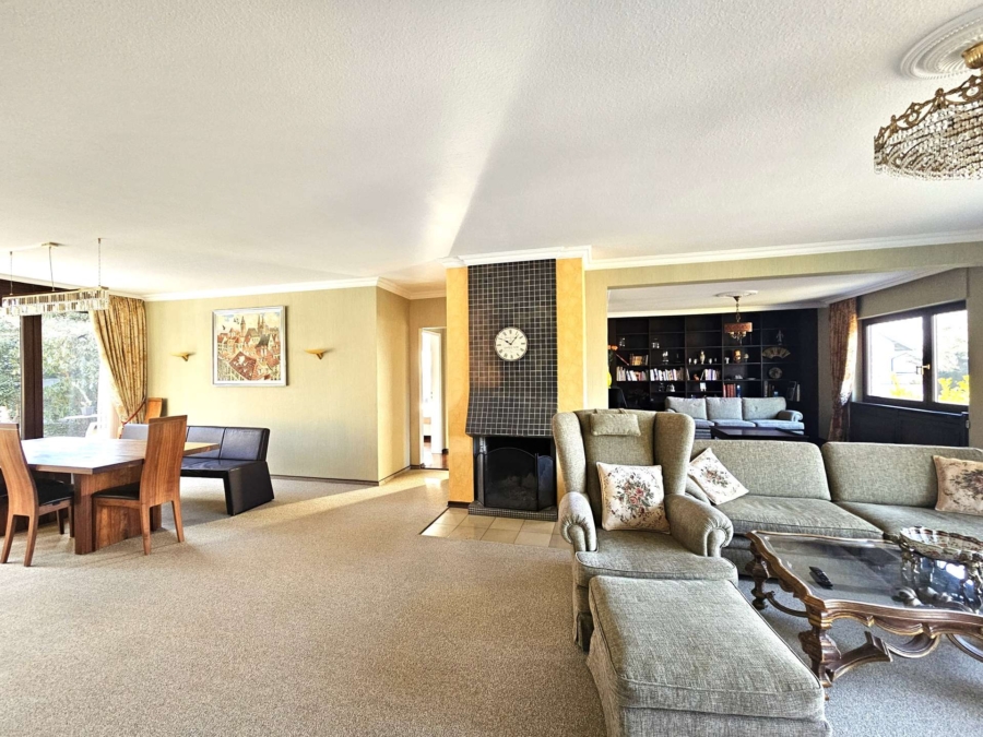 Das Herzstück des Hauses bildet der lichtdurchflutete Wohnbereich, dessen großflächige Fensterelemente den Raum mit Tageslicht erfüllen und einen herrlichen Blick in Richtung Stadtzentrum eröffnen. Ein offener Kamin gliedert den weitläufigen Wohn- und Essbereich und sorgt an kühlen Abenden für behagliche Gemütlichkeit. Der offene Grundriss vermittelt ein Gefühl von Weite und eröffnet vielfältige Möglichkeiten für eine individuelle Raumgestaltung. Mit insgesamt acht Zimmern bietet das Haus ausreichend Platz für Familienleben, Arbeiten im Homeoffice und persönliche Rückzugsorte.