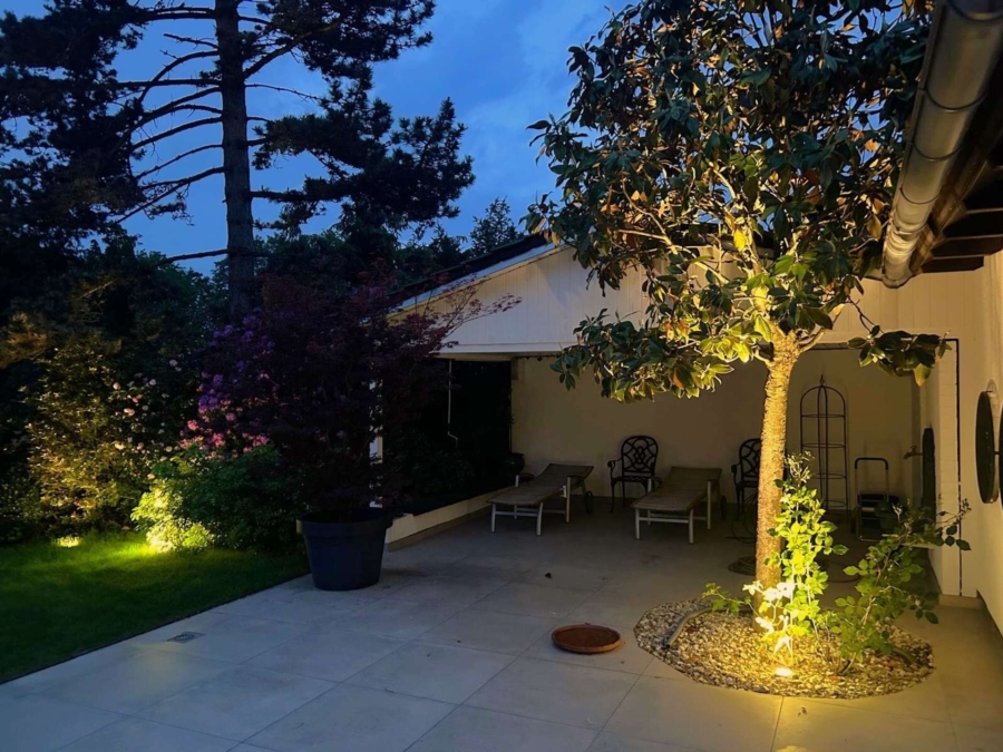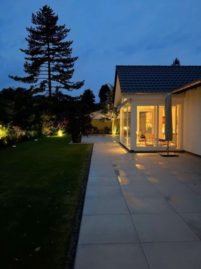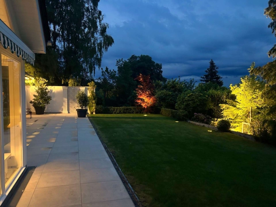 Gepflegte Rasenflächen, eingerahmt von wertvollen Buchsbepflanzungen und majestätischen Bäumen, verleihen dem Anwesen eine harmonische Atmosphäre. Eine automatische Bewässerungsanlage sowie eine dezente Unterbodenbeleuchtung wurden im Jahr 2020 installiert und tragen zur perfekten Pflege und Beleuchtung des Grundstücks bei.