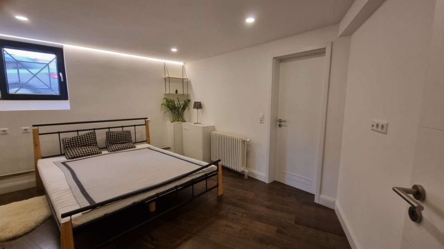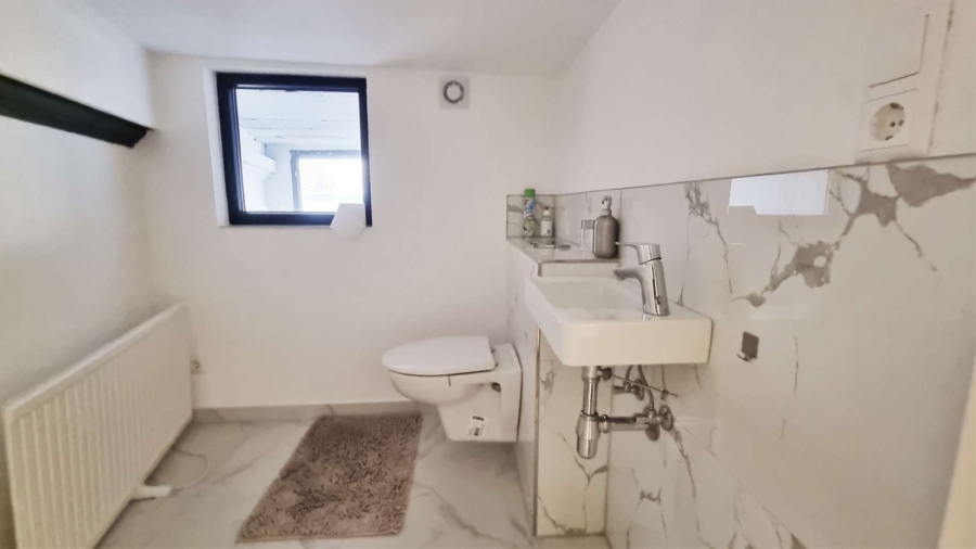 Auf dieser Ebene befindet sich zudem eine Tageslichttoilette. Über eine Wendeltreppe gelangen Sie in das untere Geschoss mit dem gemütlichen Schlafbereich sowie einem Badezimmer in eleganter Marmoroptik. Eine helle Steinverblendung an der Treppenwand setzt dabei ein dekoratives Highlight.