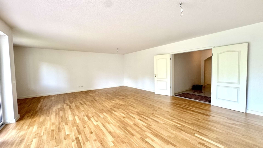 Der ca. 45 m² große Wohn- und Essbereich öffnet sich mit bodentiefen Fenstern zur Parkseite und schafft ein lichtdurchflutetes Ambiente mit freiem Blick ins Grüne. Zwei Schlafzimmer, darunter ein Masterbereich mit begehbarer Ankleide, bieten Rückzug und hohen Wohnkomfort.