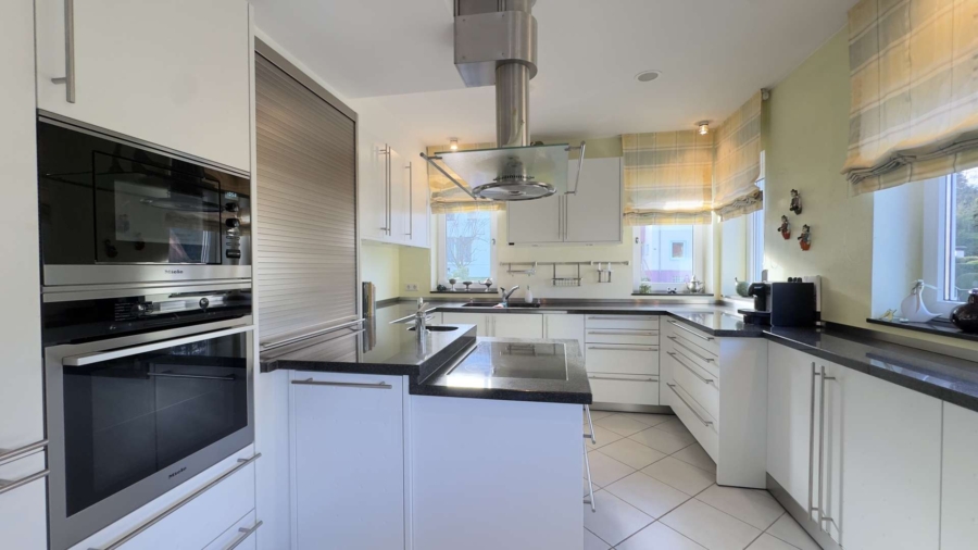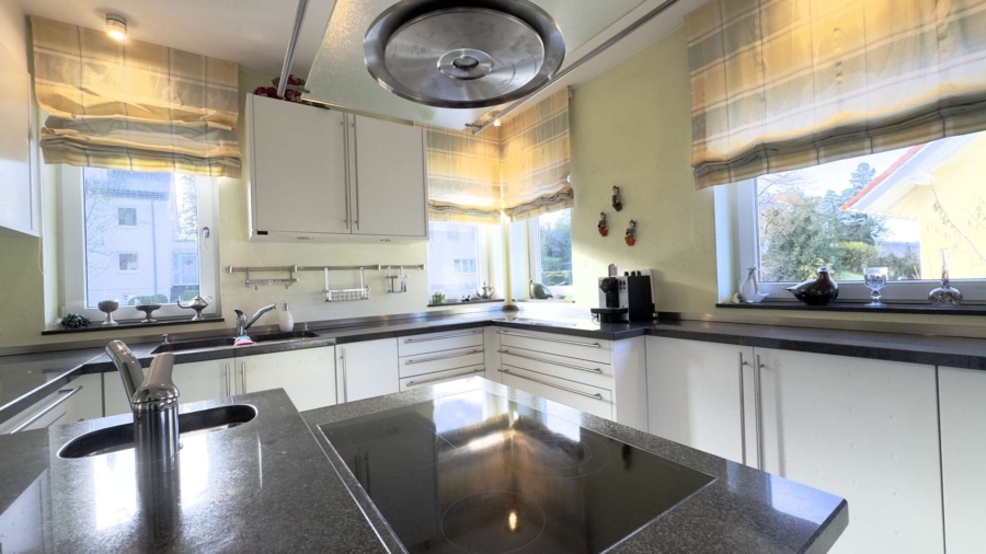 Der Wohnbereich wird durch einen Kachelofen geprägt, der an kühleren Tagen eine besondere Behaglichkeit verleiht. Die Fußbodenheizung sorgt für ein angenehmes Raumklima. Elektrisch betriebene Rollläden an den großen Fensterflächen, ein automatisches Garagentor mit Handsender sowie eine funktionale Klingel- und Türsprechanlage ergänzen den Wohnkomfort. Die vorhandene Einbauküche stammt aus dem Baujahr 1995, wurde über die Jahre sorgfältig gepflegt und präsentiert sich in einem sehr ordentlichen Zustand. Gleiches gilt für die beiden Badezimmer, die mit Emaille-Badewanne, Duschelementen, Kristallporzellan-Waschtischen und Duschkabinen der Marke HÜPPE dem gehobenen Standard ihrer Zeit entsprechen.