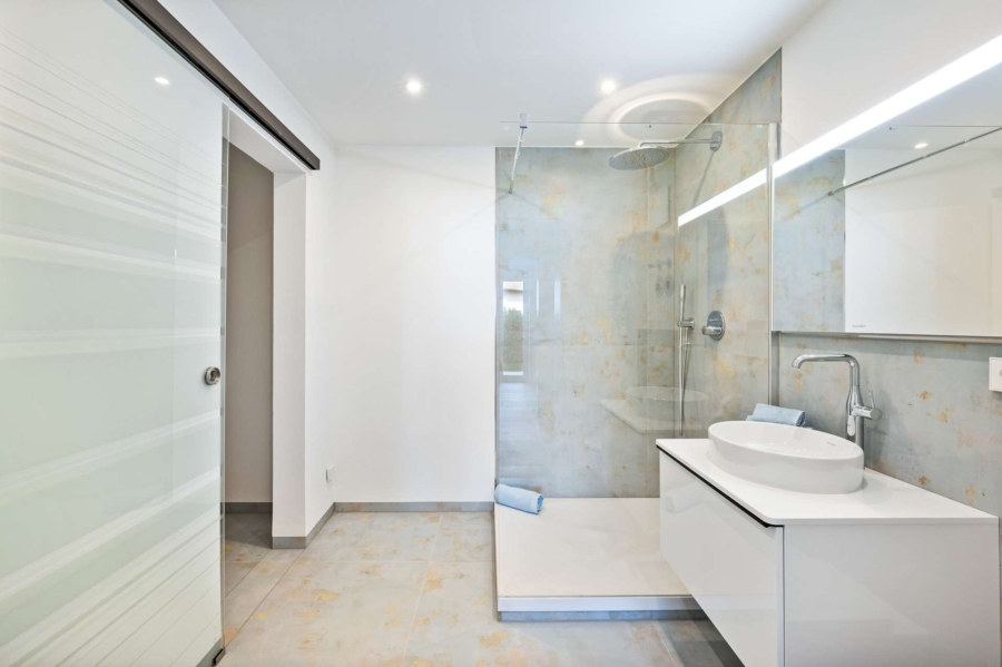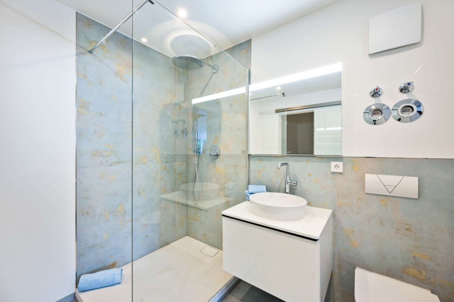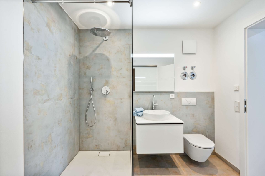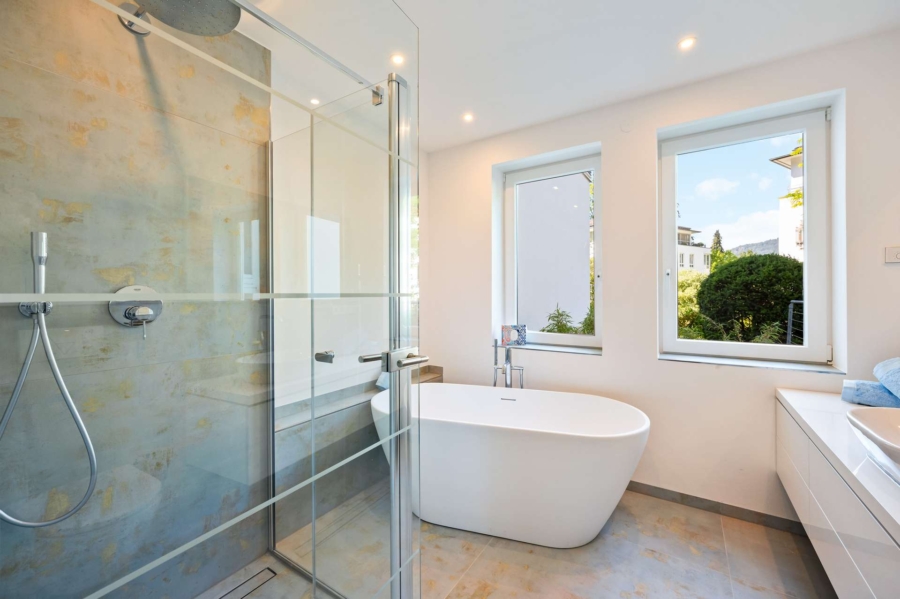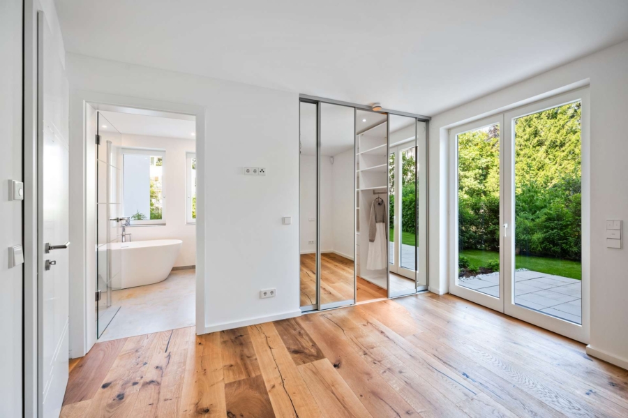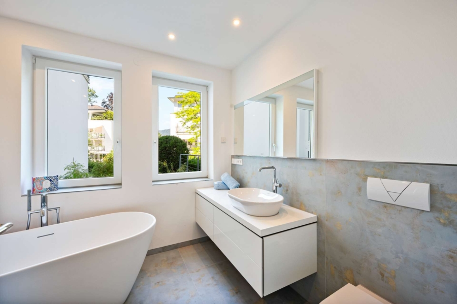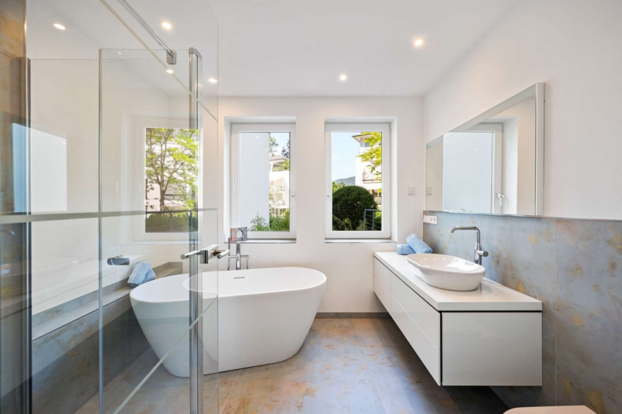 Die Immobilie bietet höchsten Wohnkomfort: Das Tageslichtbad mit Wanne und Dusche sowie das zusätzliche Duschbad und Gäste-WC sind klassisch in Weiß gehalten und mit großformatigen blau-goldenen Fliesen stilvoll akzentuiert. Bodentiefe Fensterelemente schaffen eine lichtdurchflutete Atmosphäre und verbinden Innen- und Außenbereiche harmonisch.