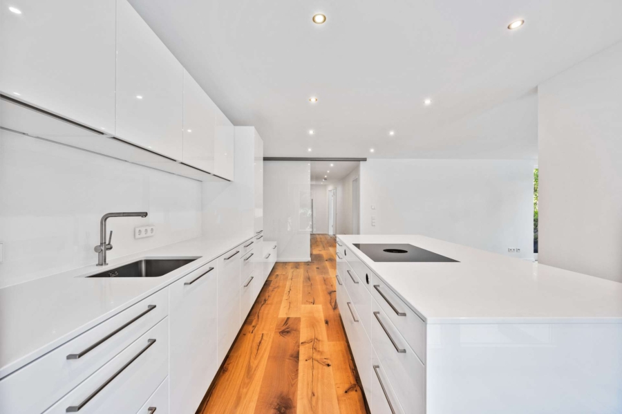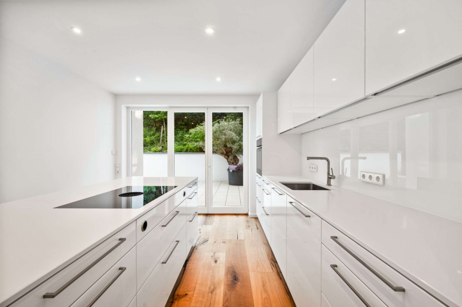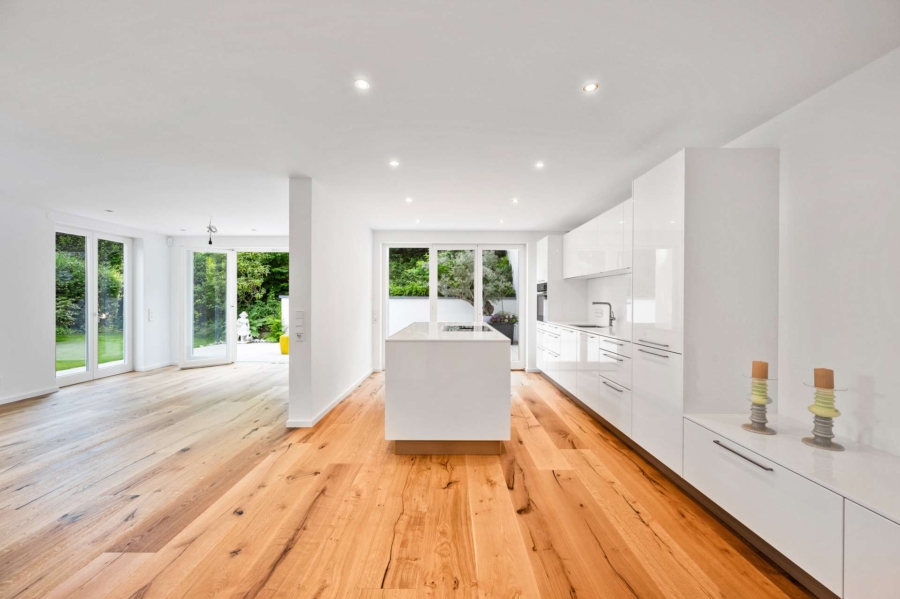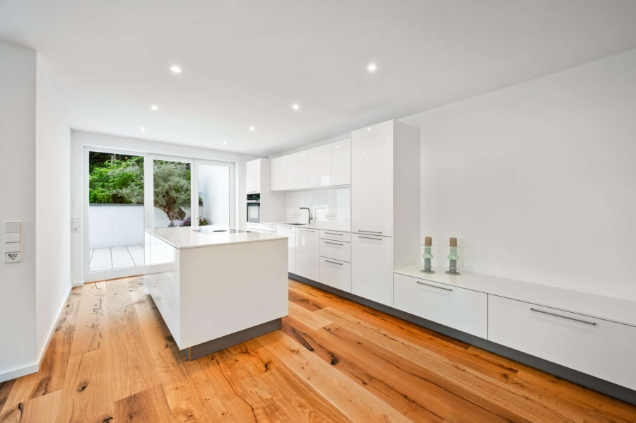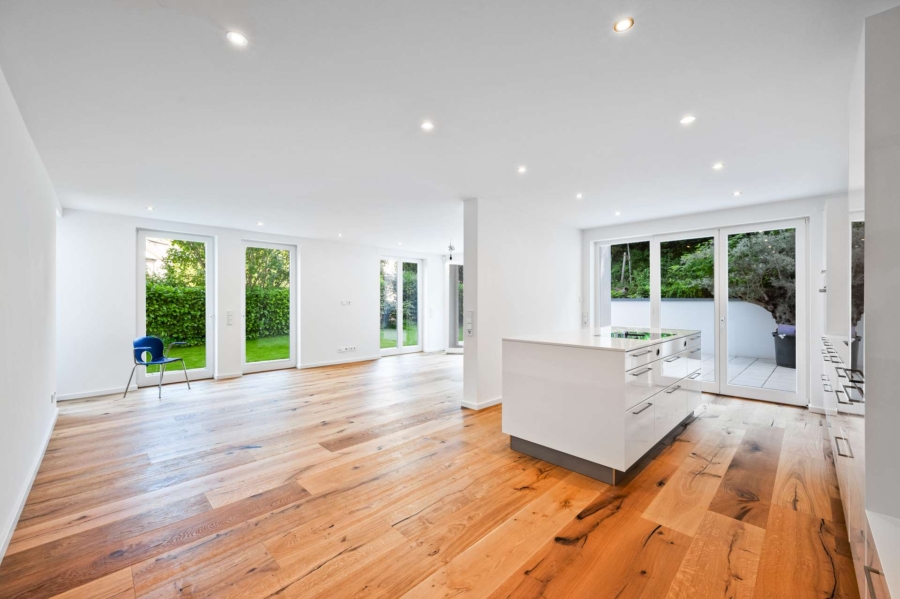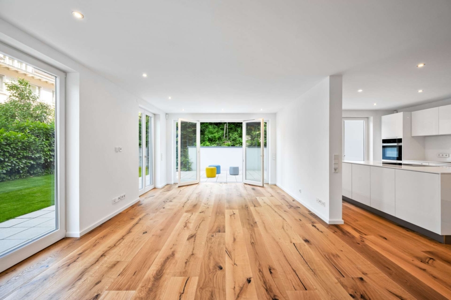 Die ca. 110 m² große Wohnfläche überzeugt durch eine durchdachte Aufteilung: ein großzügiger Wohn- und Essbereich mit teilweise offener Küche, ein Schlafzimmer mit begehbarer Ankleide sowie ein weiteres Zimmer bieten vielfältige Nutzungsmöglichkeiten. In den Wohn- und Schlafräumen wurde hochwertiger Echtholzparkett verlegt, während Wände und Decken neutral in Weiß gehalten sind und so ein zeitloses, modernes Ambiente schaffen. Eine hochwertige Markeneinbauküche inklusive Elektrogeräten vervollständigt dieses Angebot.