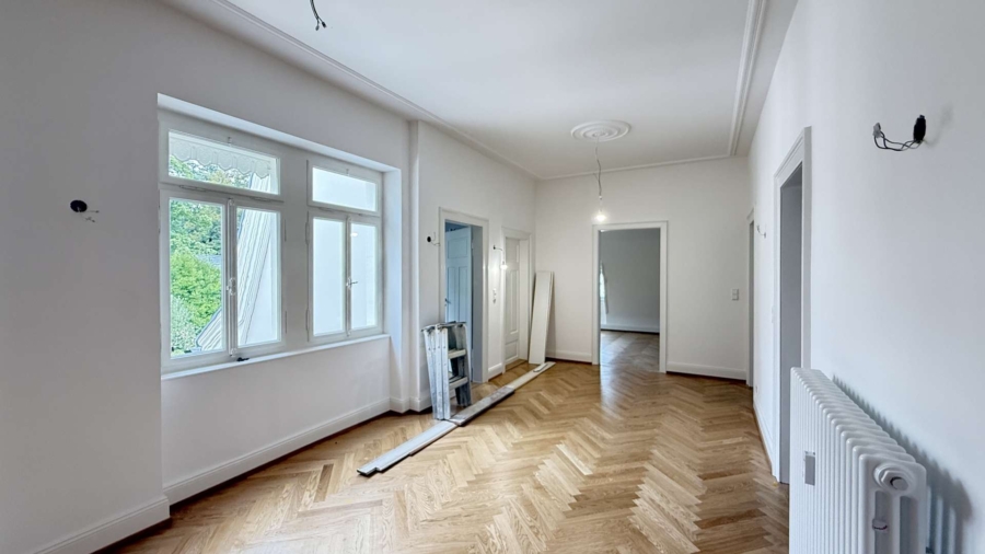 Im Hochparterre befinden sich zwei Wohneinheiten. Besonders hervorzuheben ist die rechte Wohnung, die mit fünf großzügigen Zimmern, einem prachtvollen Wintergarten mit Blick in die Lichtentaler Allee, zwei luxuriösen Bädern, einem Gäste-WC sowie einer historischen Küche mit angrenzender Speisekammer ausgestattet ist. Edle Bodenbeläge in bester Qualität unterstreichen den exklusiven Wohncharakter.